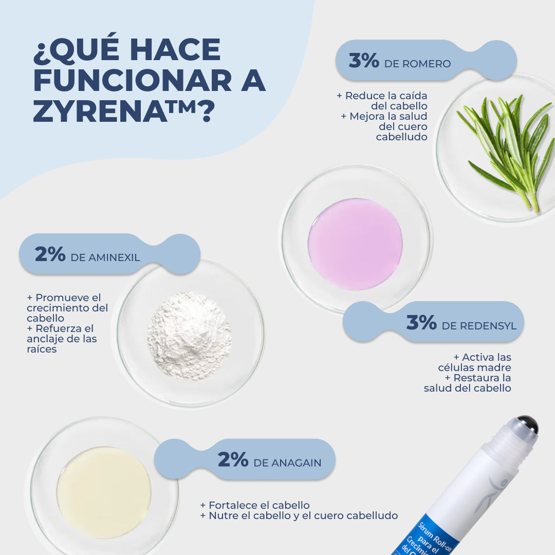 Sí. Zyrena™ está diseñado para pelo liso, ondulado, rizado o con textura más gruesa. Sus ingredientes activos trabajan directamente en los folículos, fortaleciendo el cabello y estimulando el crecimiento desde la raíz.